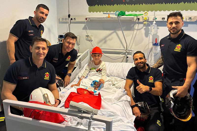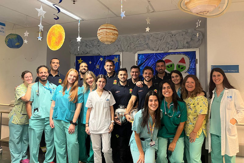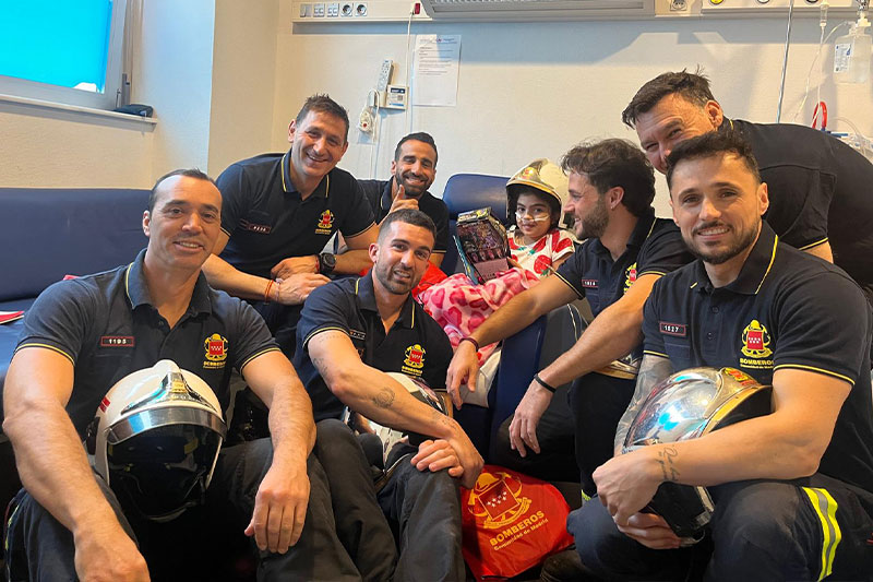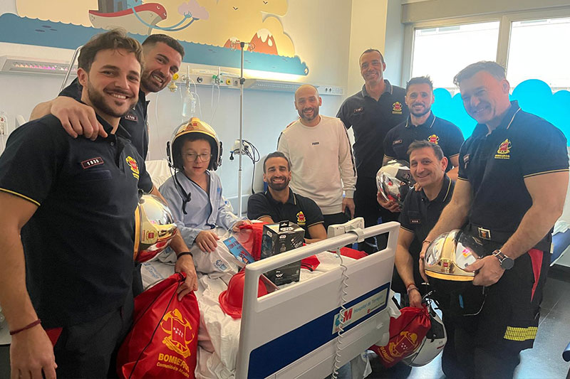 Una sorpresa que se llevaron también un par de semanas después los niños que se encontraban en el centro cuando vieron aparecer a los bomberos del parque de Torrejón de Ardoz. El grupo, encabezado por Alberto de Lorenzo, y compuesto por Sergio Puig, Ángel Cerdá, Raúl Velayos, Osnoc del Olmo y Borja Pérez, no solo visitó a los menores hospitalizados en Pediatría sino que acudió a la sala de urgencias y al hospital de día a repartir regalos entre los más pequeños, quienes les pedían fotos con ellos y usar los cascos reales de los bomberos.